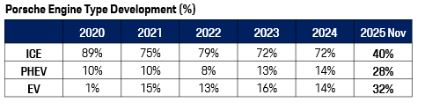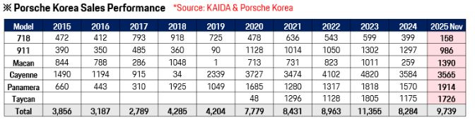 포르쉐코리아는 2025년 11월까지 총 9739대를 인도했다. 업계에 따르면 올해 중 판매량 1만대를 돌파할 것으로 예상된다. 여기에는 전동화 모델의 성장이 두드러졌다. 올해 포르쉐코리아가 판매한 차량 중 전동화 모델은 PHEV 28%, BEV 32%로 전체의 60%에 달한다. 2020년 BEV 차량이 1%에 불과했던 것을 감안하면 급상승한 수치다.